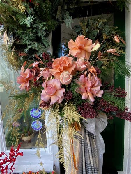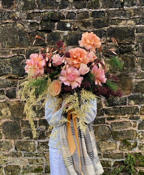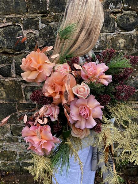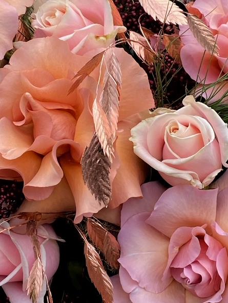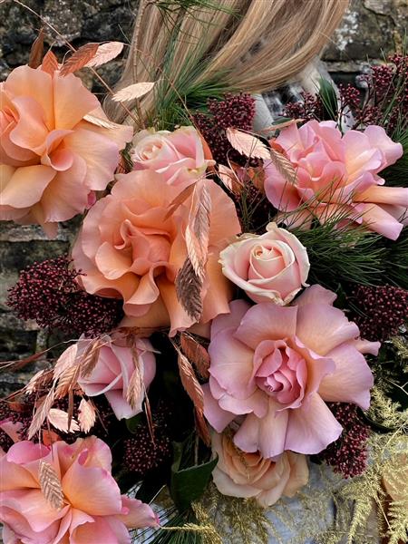 A gorgeous winter-ready bouquet featuring rich, flexed toffee roses paired with soft pastel pink roses. Finished with seasonal spruce, elegant copper grasses, and shimmering gold asparagus, this arrangement brings warmth and luxury to the colder months.
