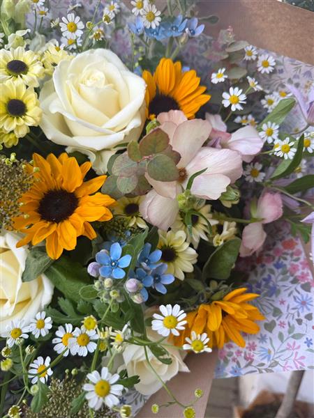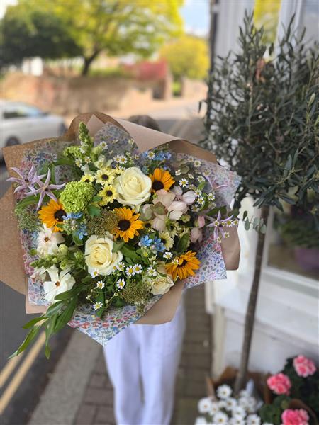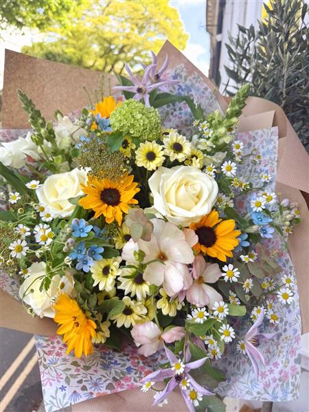 Blue Skies & Sunshine Bouquet – a fresh, uplifting blend of pale blues, soft whites, and gentle yellow tones, capturing the feeling of a glorious summer’s day in the South Downs. Light, airy, and full of sunshine-filled charm.