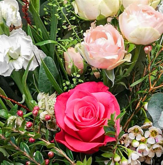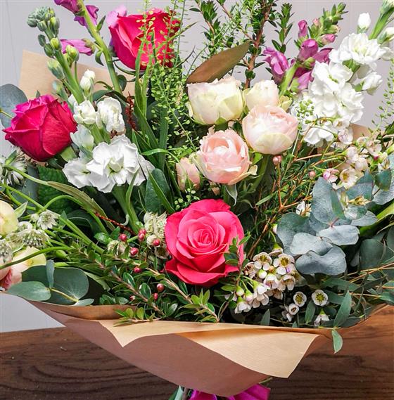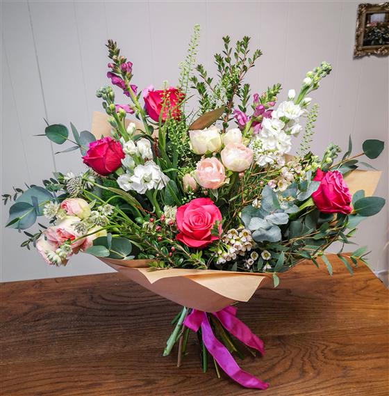 A wonderful expression of love with a combination of delightful large headed pink roses and blush pink spray roses, with added delicate white seasonal flowers. Romantic, Blushing, Feminine!