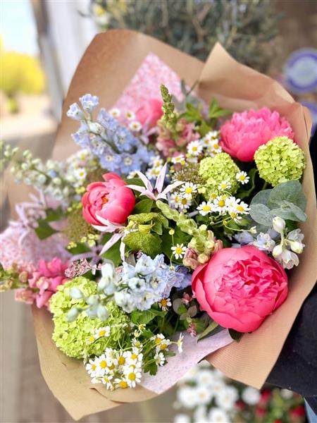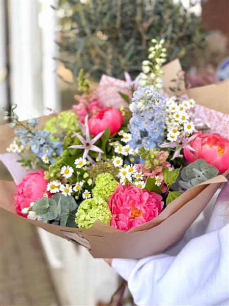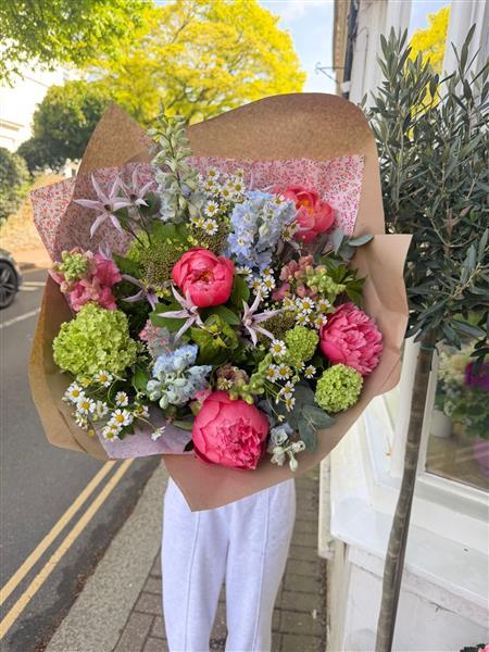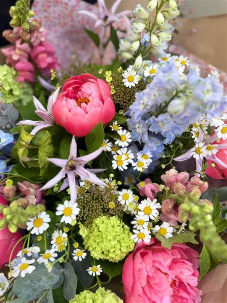 A vibrant blend of seasonal coral charm peonies, paired with delicate tanacetum daisies, lilac clematis, soft blue delphiniums, and coral-pink antirrhinums, comes together in this eye-catching bouquet. Bursting with the fresh energy of spring and the warmth of early summer—available now!