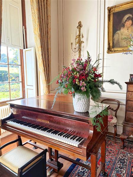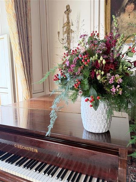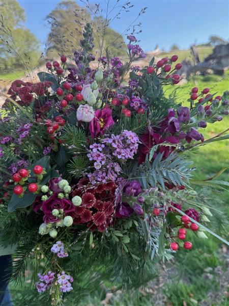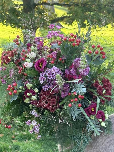 Burgundy antirrhinums and vivid red lisianthus bring depth and drama, contrasted beautifully by the jewel-like tones of crimson santini and vibrant pink wax flower. Sprays of hypericum berries and ornamental grasses add rustic charm and movement, echoing the wild, wind-swept hedgerows of the colder months.