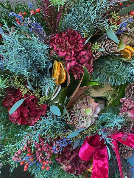 A celebration of winter’s softer side — this wreath is crafted from a gorgeous selection of spruce and pine with layers of silver eucalyptus and clusters of hydrangea, lavender, peppercorn berries, bright pink heather, pinecones, and rosehip berries bring colour and texture inspired by a winter garden in bloom.