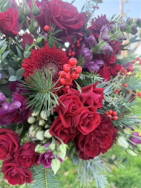Pompom burgundy germini add a playful rhythm, while red ilex berries bring a festive sparkle. Chestnut-coloured santini introduce an earthy richness that grounds the bouquet and beautifully complements the surrounding reds. Silvery mimosa glimmers like morning frost, nestled among fragrant local spruce, holly foliage, and winter greenery.