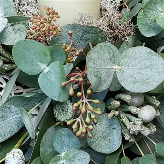 An elegant and festive centrepiece crafted with seasonal spruce and a beautiful mix of eucalyptus varieties and pods. This arrangement is rich in natural textures, long-lasting, and carries the wonderfully fresh, aromatic scent of eucalyptus. The ivory candle sits at the heart of the design, creating a warm, inviting glow—perfect for Christmas tables, sideboards, or cosy winter gatherings.