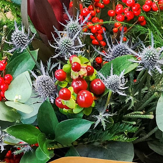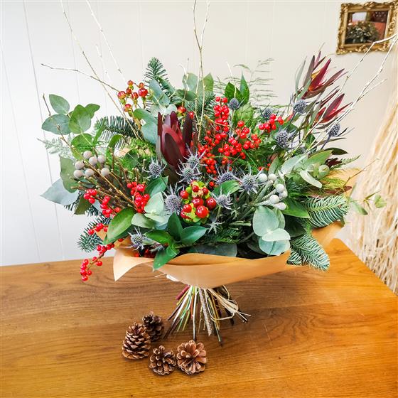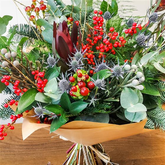 Our Red Florist’s Choice Christmas Bouquet is beautifully hand-crafted by our expert florists using the finest seasonal red blooms, complemented with lush winter foliage and subtle festive accents. Each bouquet is individually designed, ensuring every arrangement is unique and full of Christmas spirit.