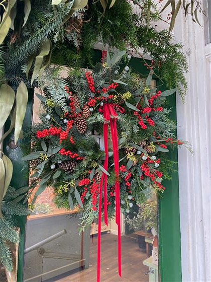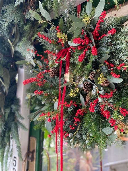 Lovingly handmade by Apple Mint Florist with a gorgeous selection of locally sourced spruce and pine, the Scarlet Frost Christmas Wreath captures the crisp beauty of winter with a touch of festive warmth. Berried and silver cineraria eucalyptus with added eucalyptus flower pods that add soft texture and silvery tones, while clusters of flame-bright red ilex berries bring a striking pop of colour — like berries glistening through a morning frost.