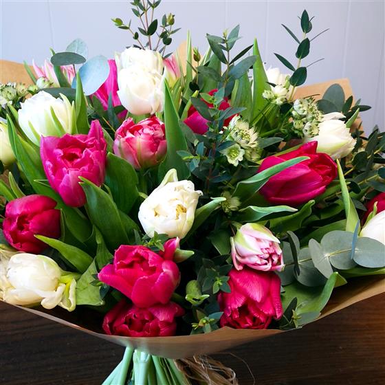 A mixed bouquet of tulips with seasonal green and delicate filler flowers.