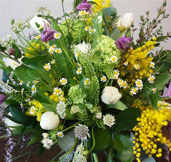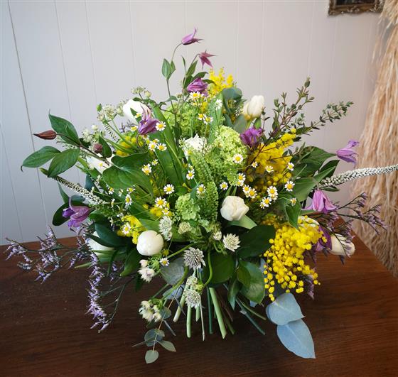 A fresh spring bouquet with soft splashes of yellow, white, and lilac. Inspired by wildflowers in bloom, it feels light, natural, and full of new-season energy — like a gentle spring morning brought indoors.