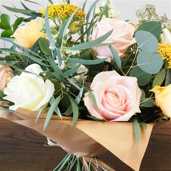 A beautiful bouquet of roses in soft spring shades of light yellow, peach, and blush pink. Fresh and elegant, these delicate tones blend effortlessly to create a warm, uplifting gift — perfect for brightening someone’s day.