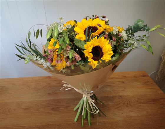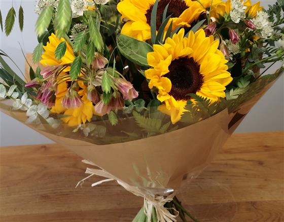 A stylishly presented colurful bouquet of sunflowers with complementing seasonal flowers and foliage.
