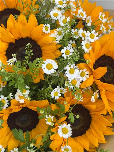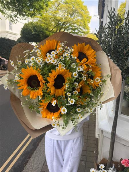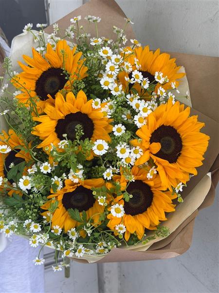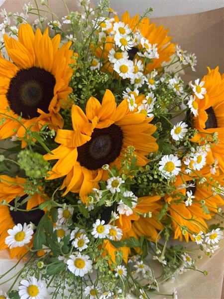 Sunshine Fields is a Pure Joy in flowers! This radiant bouquet of mini daisies and glorious sunflowers is bursting with happiness and natural charm. Perfect gift to lift spirits and spread pure joy.