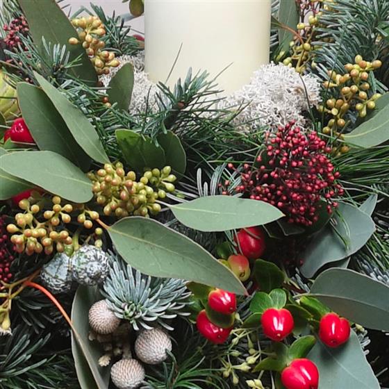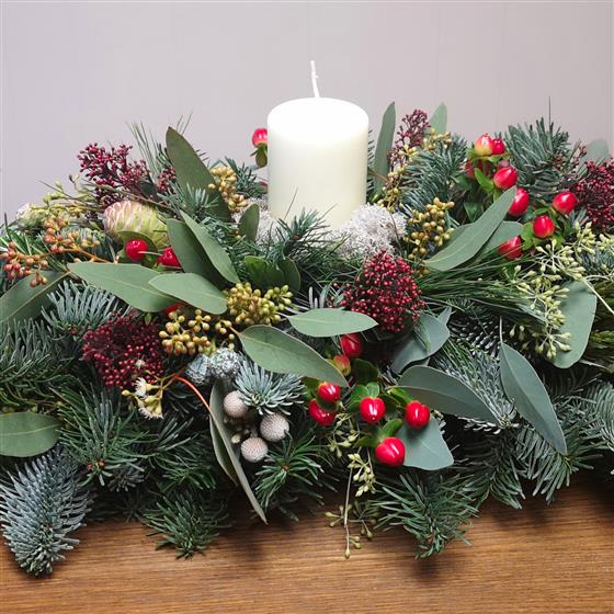 This is a lovely big table piece with an ivory candle sitting snugly in a mix of blue pine, berries, pods, brunia and eucalyptus. It has a really natural, wintery feel and lasts beautifully—perfect for a larger table or Christmas gathering.