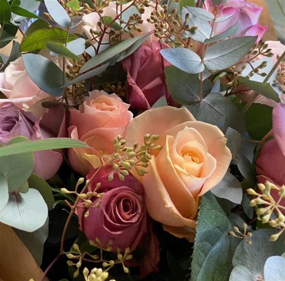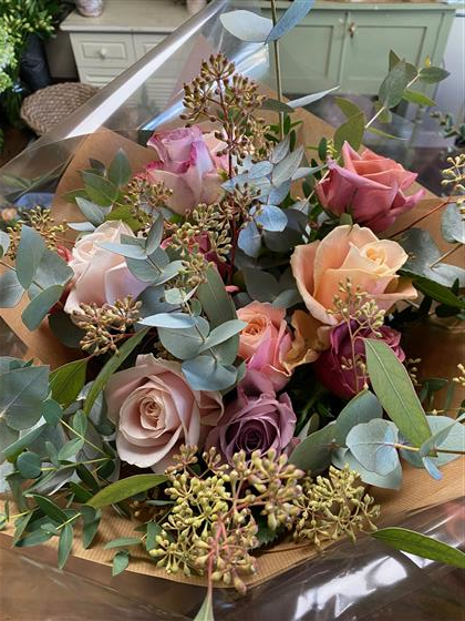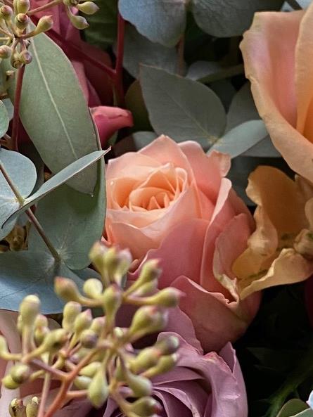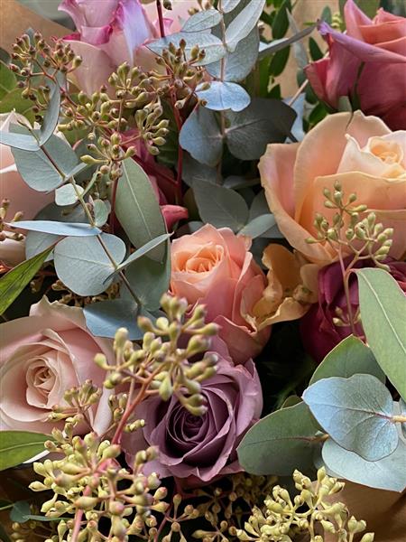 A beautiful winter bouquet featuring a carefully chosen selection of the season’s best blush and toffee roses, complemented by soft winter-green foliage.